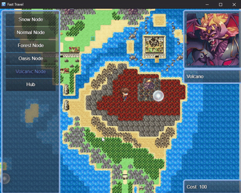This plugin lets you create fast travel map(s) for your own game project. These fast travel maps are graphical and do not use any RPG Maker map for their functionality. That being said, since it is graphical in nature, there are liberties a game designer can take when building their own map which can be something very simple to something extremely complex.